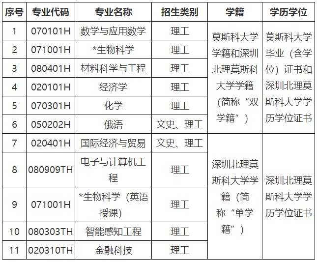 说明:(1)*生物科学专业按双学籍和单学籍平行招生,培养方案均依据莫斯科大学该专业培养标准制定。考生报考该专业时,需仔细阅读高考报名所在地公布的招生专业目录。